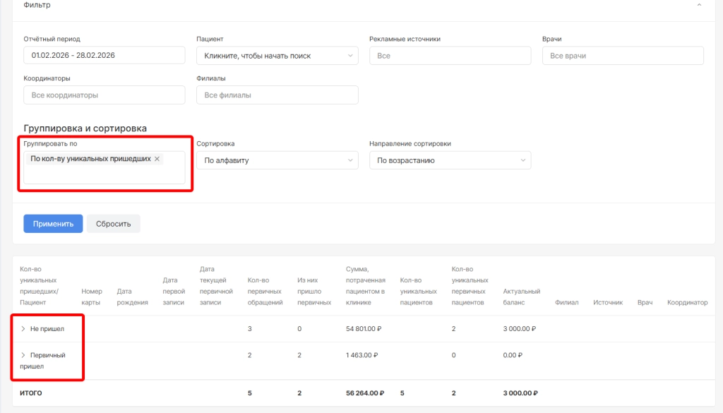 В отчет с типом “Первичные пациенты” добавили новый параметр группировки “по кол-ву уникальных пришедших”. При выставлении такого параметра в отчете отображается группировка колонки “Не пришел” и “Первичный пришел”
