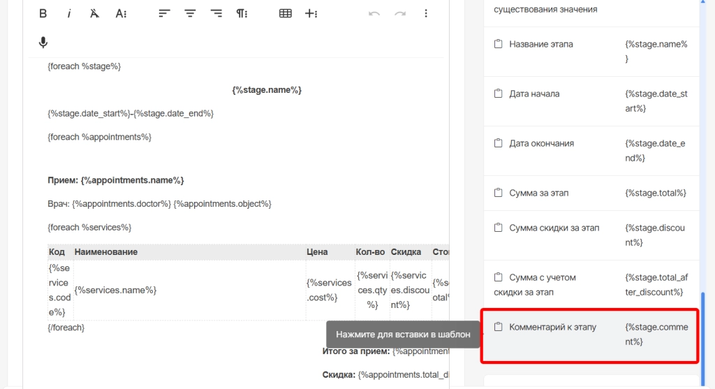 2. В модуле настроек “Шаблоны документов” для печатной формы финансового плана добавили новую переменную “Комментарий к этапу лечения”