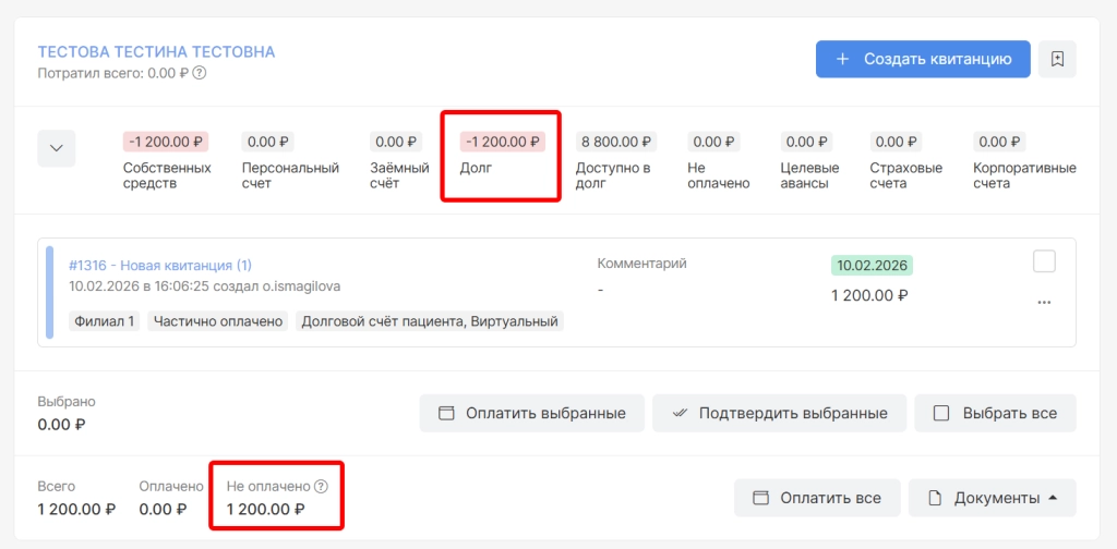 При включенной опции, если квитанция пациента будет оплачена с помощью долгового счета, то в колонке “Оплачено” не отобразится эта сумма по долговому счету, а отобразится в колонке “Не оплачено”