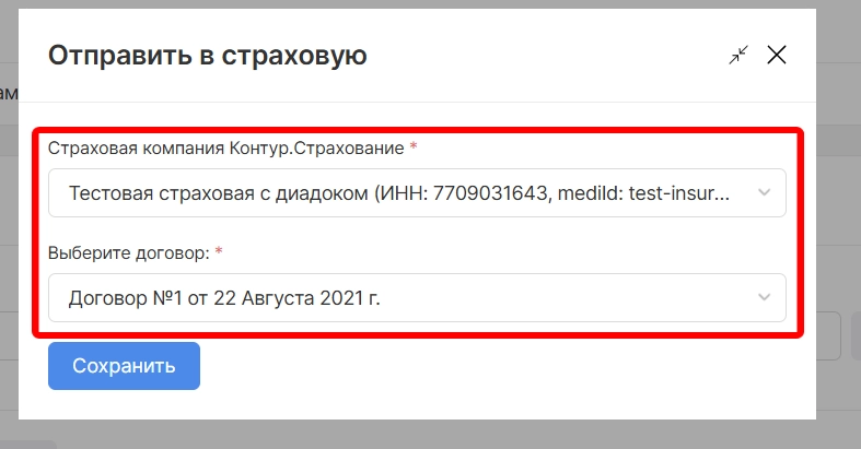 в открывшейся форме необходимо выбрать страховую для отправки и нажать “Сохранить”