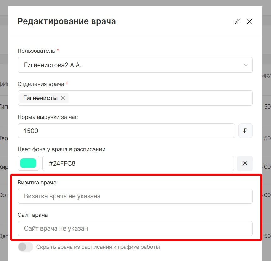 Для работы тегов также требуется предварительная настройка ссылок на видео визитку и сайт. Для этого необходимо в модуле “Сотрудники” перейти в раздел “Врачи” и при добавлении или редактировании врача указать необходимые данные в полях: