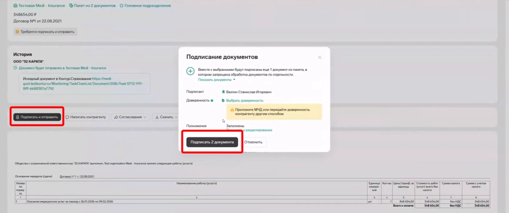 после просмотра информации о счете, акте и реестре для страховой необходимо нажать на “Подписать и отправить”, а также подтвердить действие во всплывающем окне