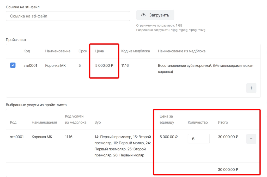 При включенной опции при создании заказ-наряда и печати бланка будут отображаться колонки со стоимостью услуги лаборатории и общей стоимости за количество