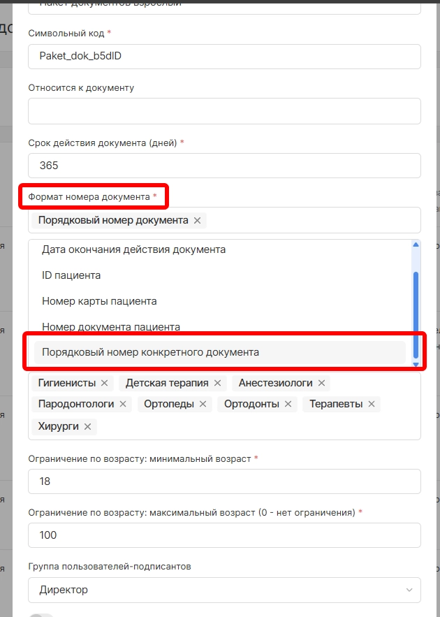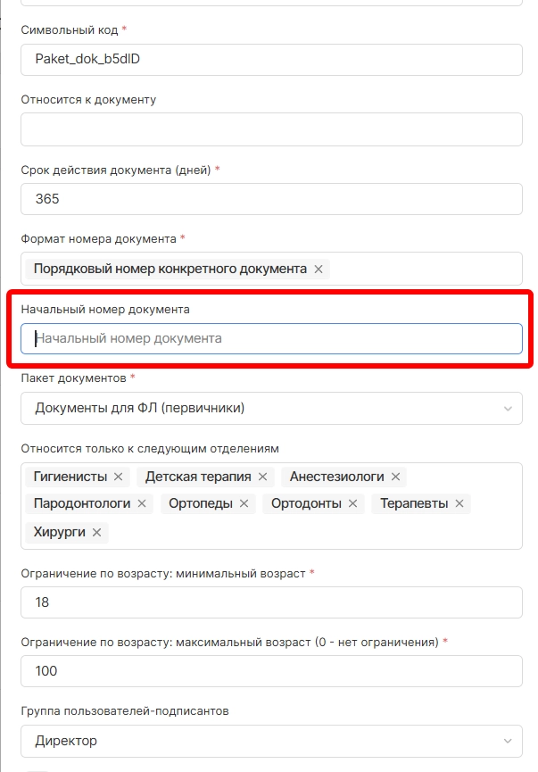 новое поле “Начальный номер документа”, позволяющее указать порядковый номер,с которого должна начинаться нумерация данного типа документа. Поле актуально только при выбранном формате номера документов “Порядковый номер конкретного документа”