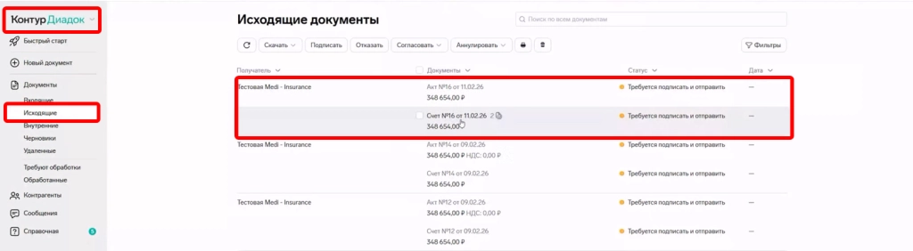 В личном кабинете Контур.Диадок в разделе “Исходящие” отобразятся отправленные из DentalPRO документы, а именно: счет на оплату, акт по счету и реестр по пациентам