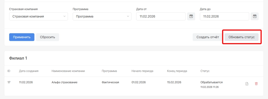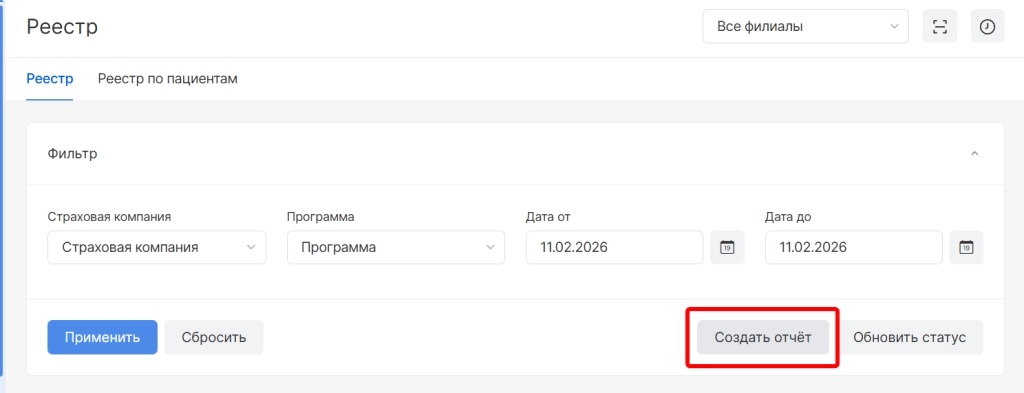 в модуле “Юридические лица” и разделе “Реестр по страховым компаниям” необходимо выбрать опцию “Создать отчет"