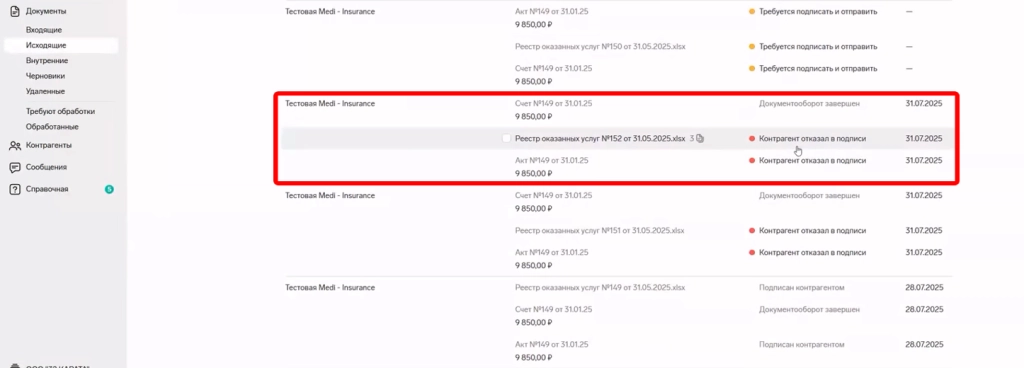 контрагент отказал в подписи (если документы не прошли проверку)