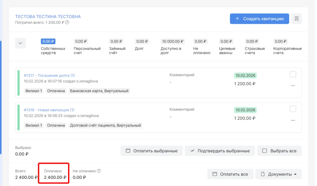 После погашения долга пациента, сумма по квитанции на погашение отобразится в колонке “Оплачено”