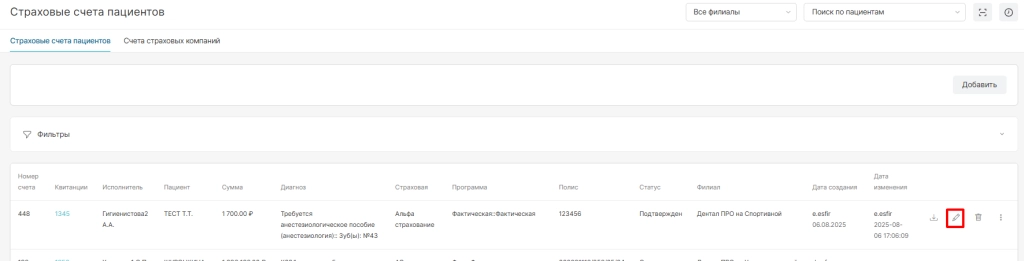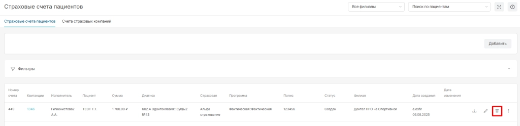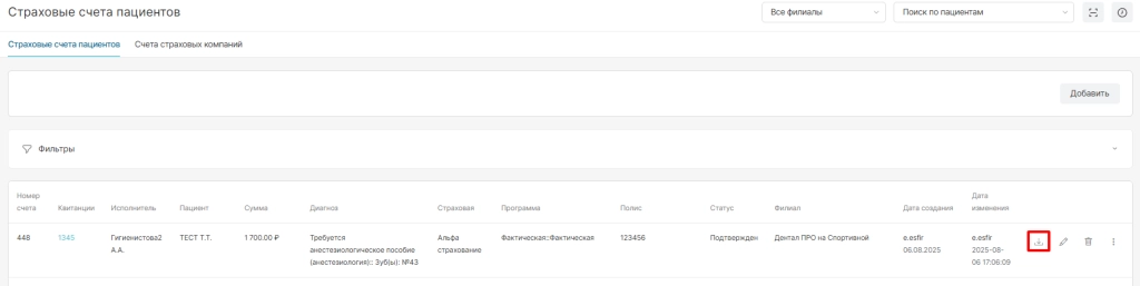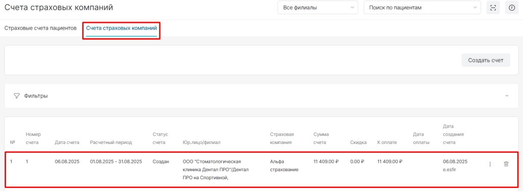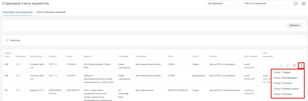 В разделе “Страховые счета пациентов” отображаются все созданные счета уникально по каждому пациенту и опции по ним: