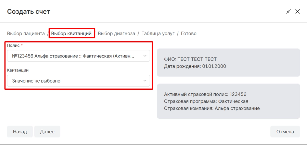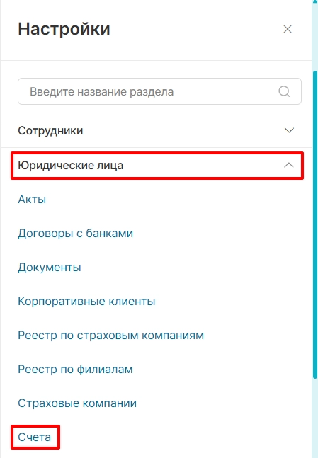 После того, как квитанции с приема по страховому прайсу будут оплачены в кассе, формируются "Счета" в модуле "Юридические лица", во вкладке "Счета".