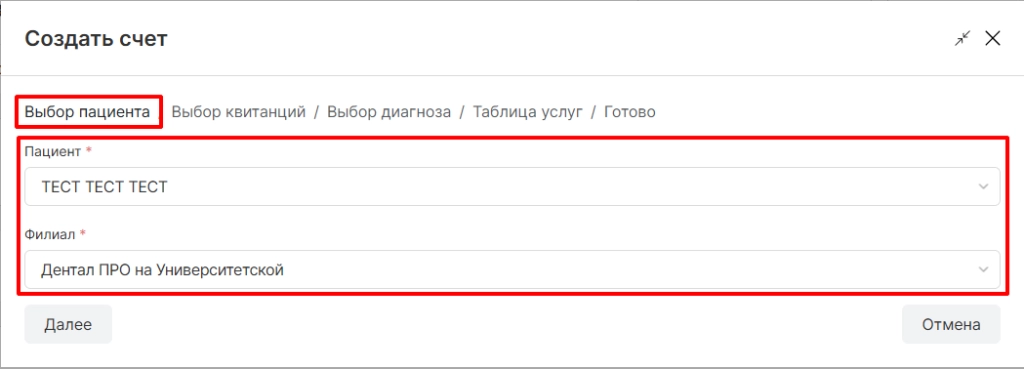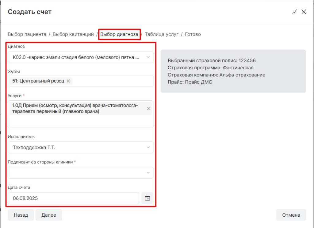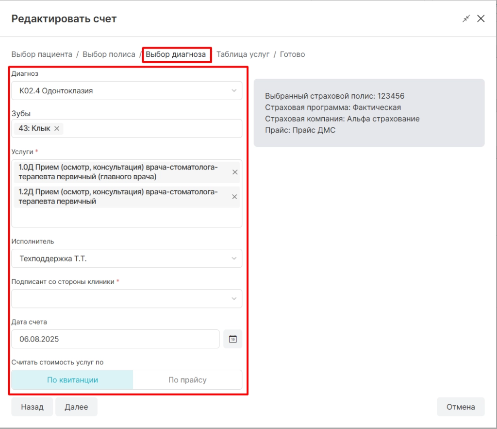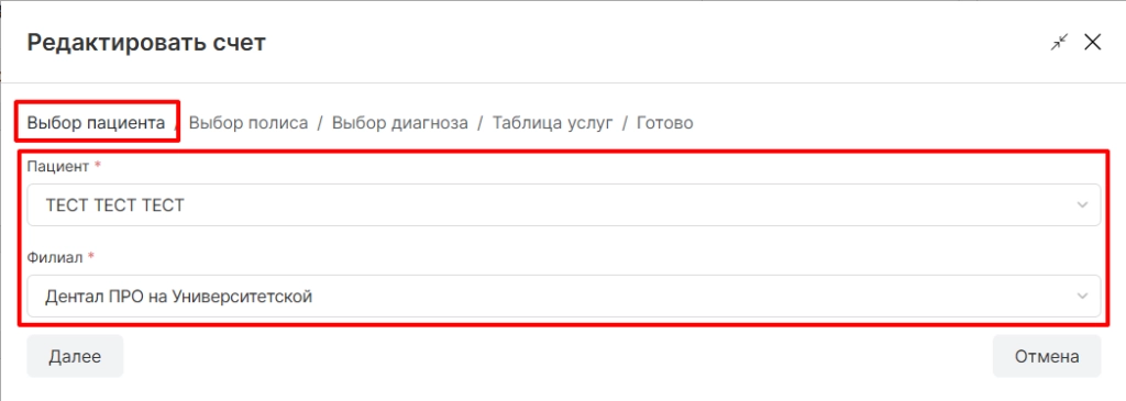 Обратите внимание! После оплаты квитанции страхового пациента счет будет отображаться автоматически, в ситуации когда созданный счет был удален или его необходимо изменить, данная опция будет полезна.
