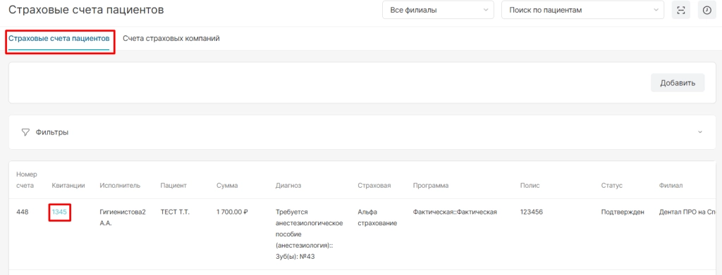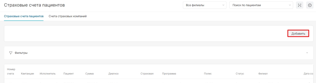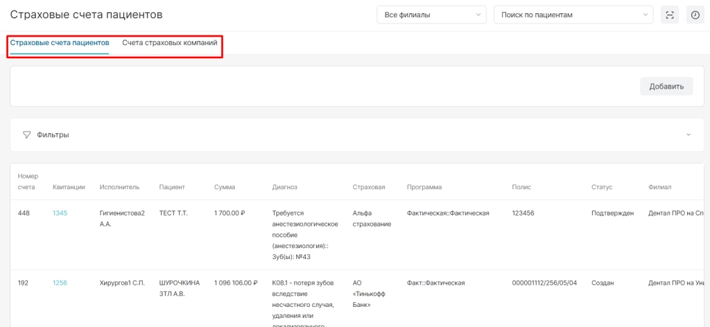 Можно посмотреть страховые счета пациентов и счета страховых компаний.