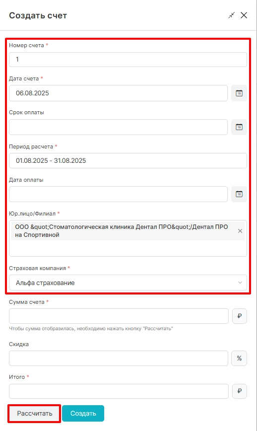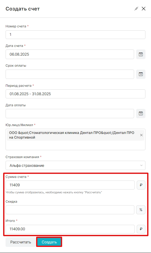 После расчета система автоматически отобразит общую сумму для счета по всем пациентам страховой компании, доступно указание скидки (если клиника предоставляет ее страховой компании). Далее необходимо нажать опцию “Создать”.