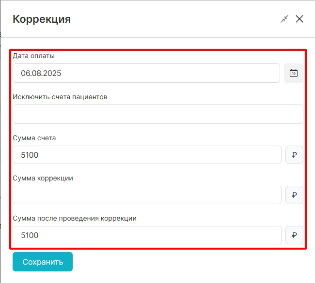 коррекция счета (дата оплаты, исключение квитанций пациентов)
