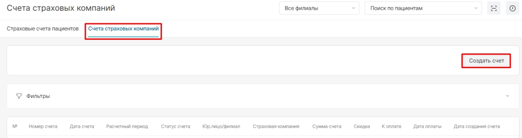 В модуле “Счета”, в разделе “Счета страховых компаний” есть возможность создания общего счета для страховой компании по всем пролеченным пациентам.