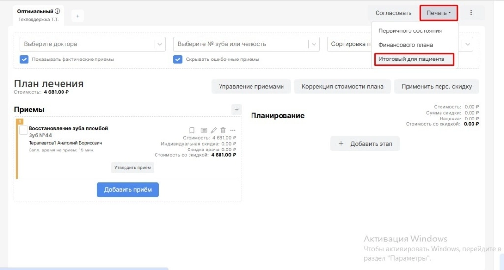 После настройки своего шаблона плана лечения данный план будет доступен для печати в плане лечения пациента