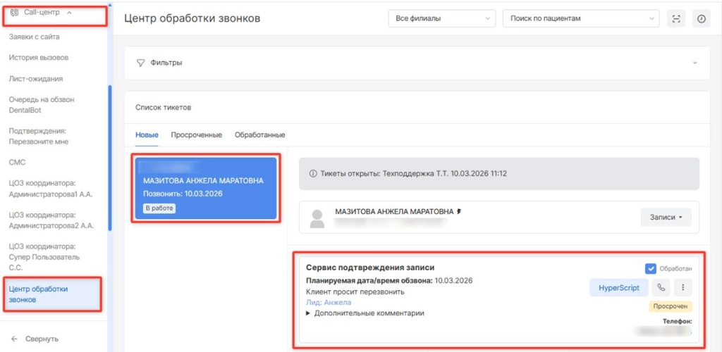 Тикет для прозвона отобразится в модуле “Call-центр” - “Подтверждение: перезвоните мне”.