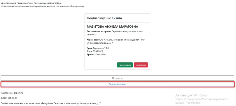 В случае, если у пациента возникли вопросы, имеется возможность создать запрос на звонок. Для этого на открывшейся странице необходимо выбрать опцию “Перезвоните мне”.