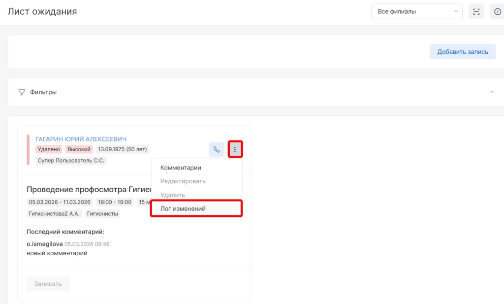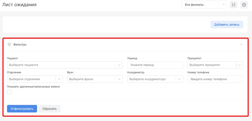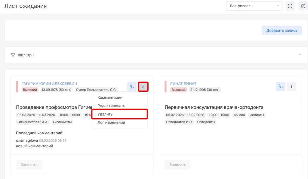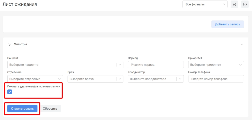 После удаления пациент не будет отображаться в списке, но можно будет найти историю удаления. Для этого в поле фильтрации необходимо выбрать параметр “Показать удалённые/записанные записи” и нажать “Отфильтровать”.