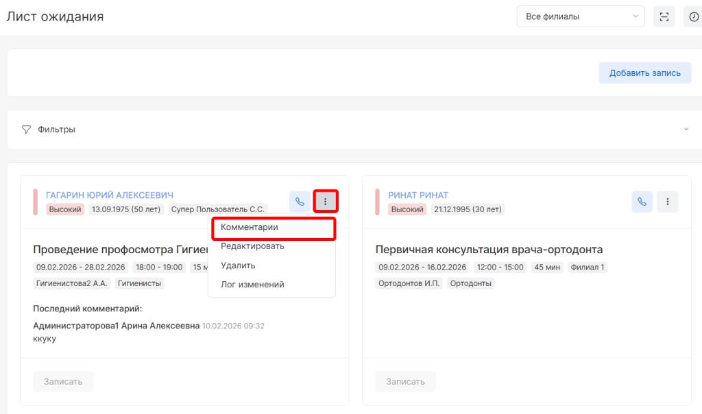 По внесенным пациентам доступна опция внесения нового комментария по пациенту. Для этого в опциях необходимо нажать “Комментарии”.