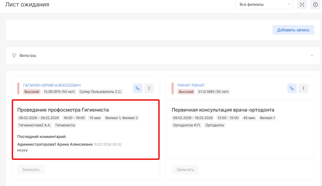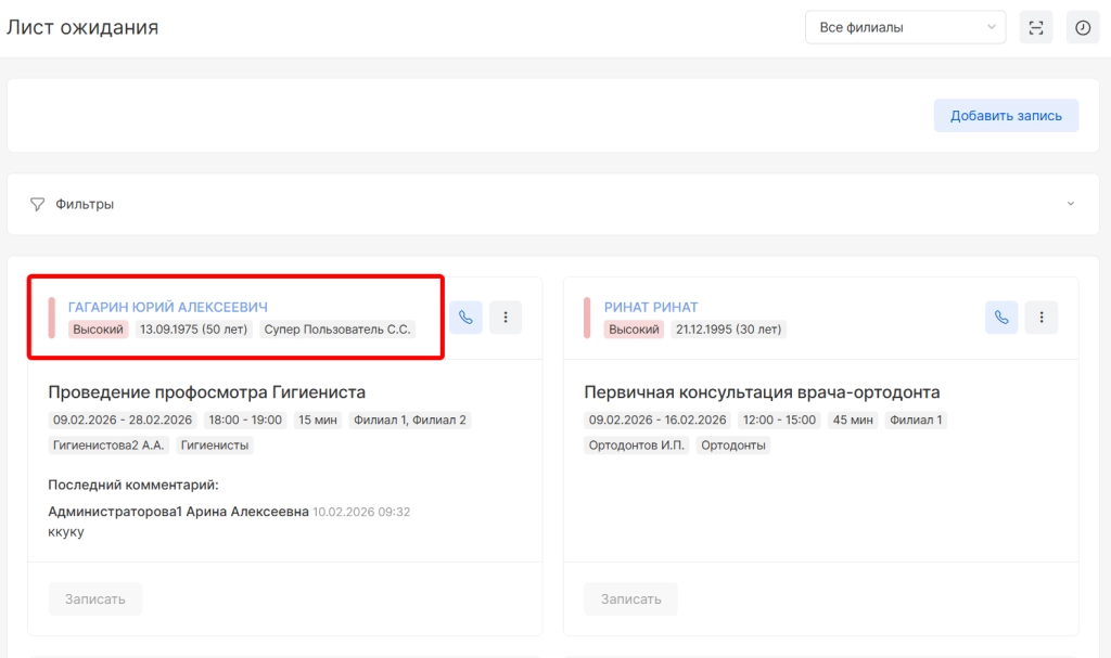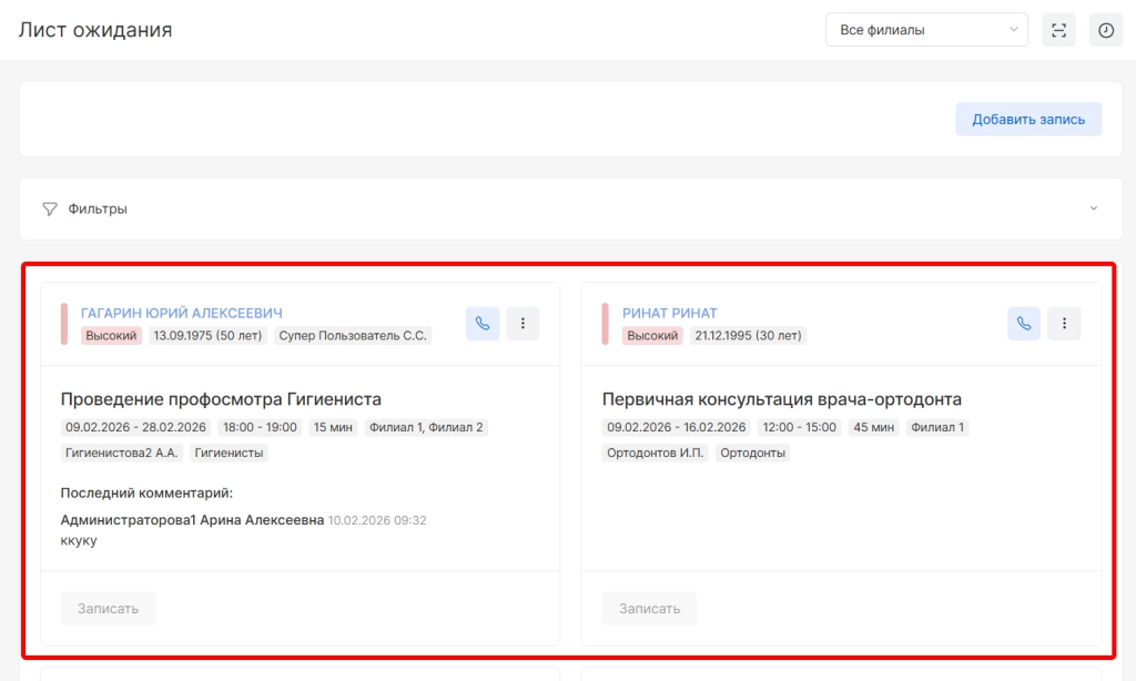 ВНИМАНИЕ! Все записи пациентов располагаются по приоритету: от высокого к низкому. Приоритет указывается в момент добавления пациента в лист ожидания