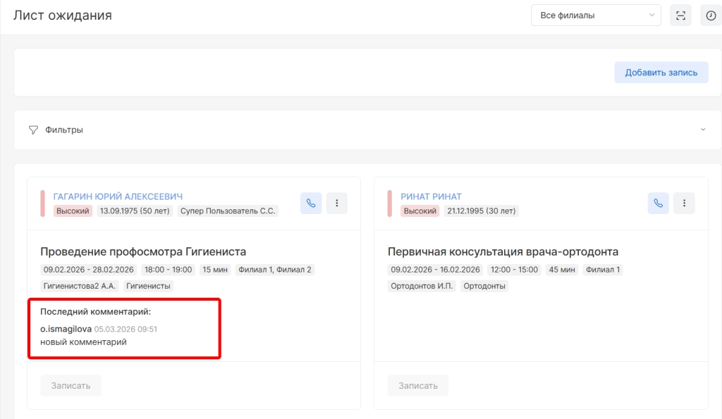 последние комментарии из инфокарты (комментарии указываются в момент добавления в лист ожидания).