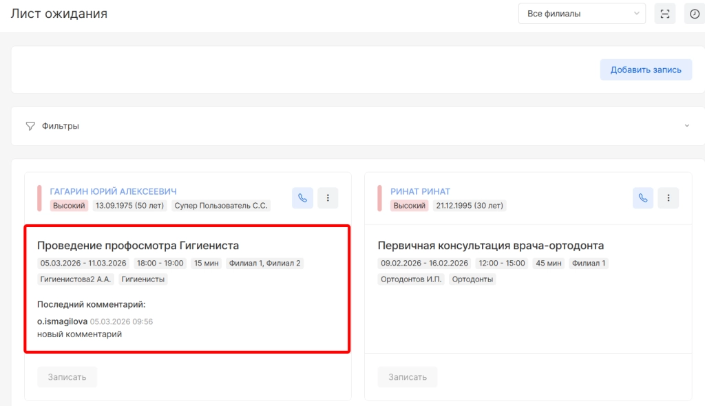 Ниже отобразится список пациентов, добавленных в лист ожидания.