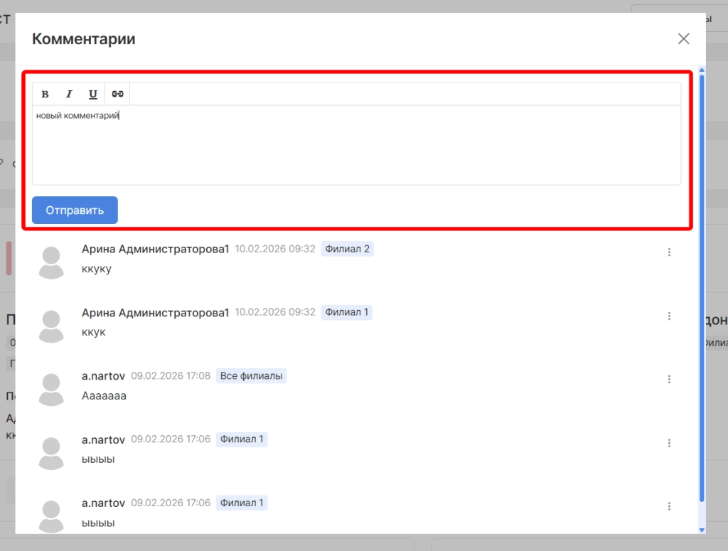 В открывшейся форме в текстовом поле следует указать новый комментарий и нажать “Отправить”.