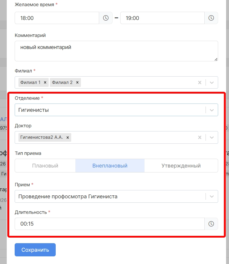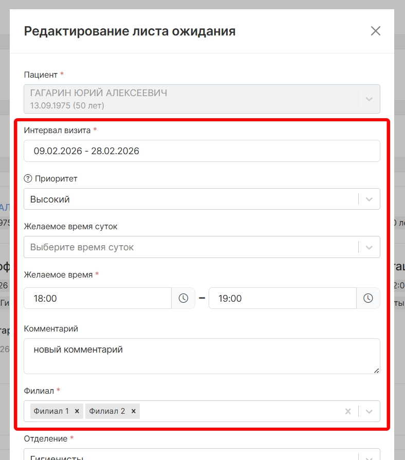 отделение (отобразится автоматически на основании параметров текущей записи, можно изменить),