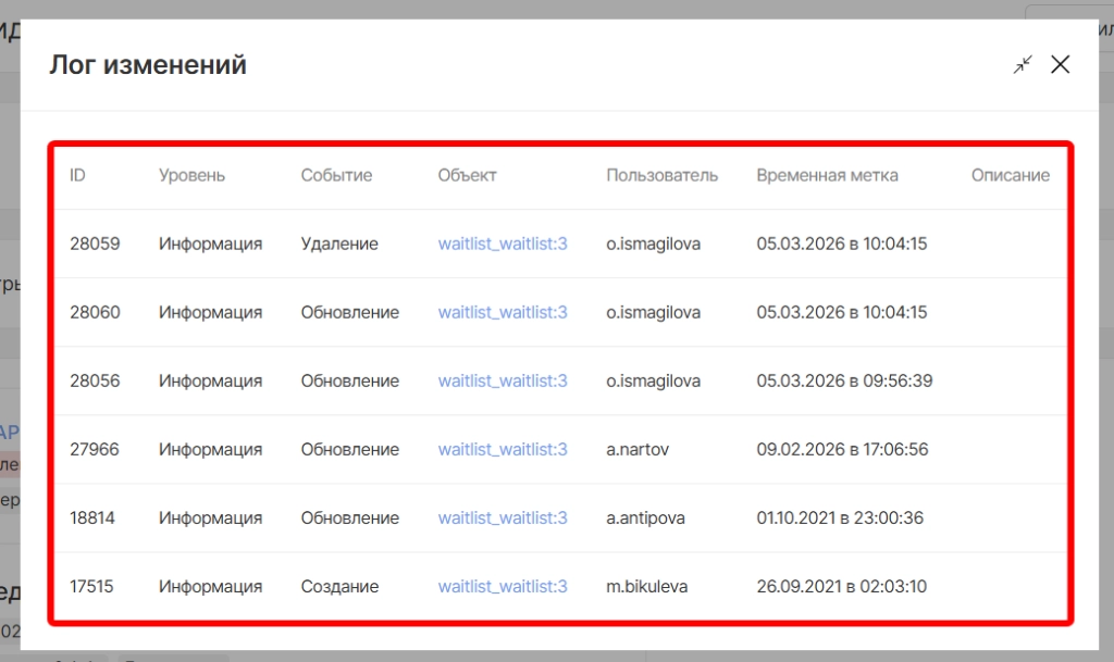 можно будет отследить историю пациента от добавления в лист ожидания до удаления с указанием даты и инициаторов действия.