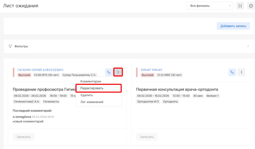 Для внесенных пациентов доступна опция редактирования параметров ожидания. Для этого необходимо выбрать опцию “Редактировать”.