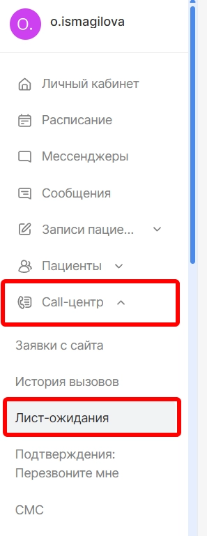 После добавления пациентов в лист ожидания формируется список листа ожидания. Для просмотра и работы со списком ожидающих необходимо перейти в модуль "Call-центр" и раздел "Лист ожидания".