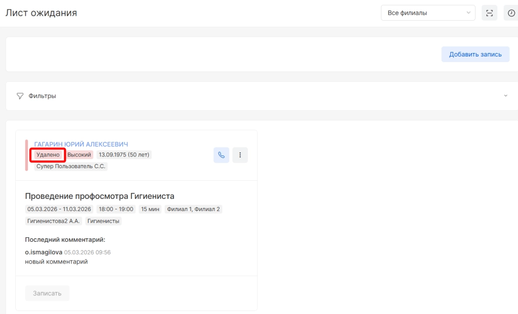 удаленные/записанные записи (позволяет вывести обработанные заявки листа ожидания).