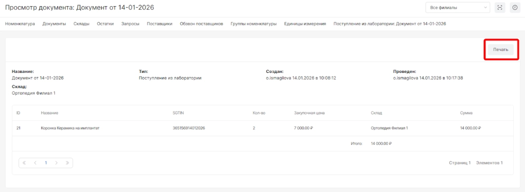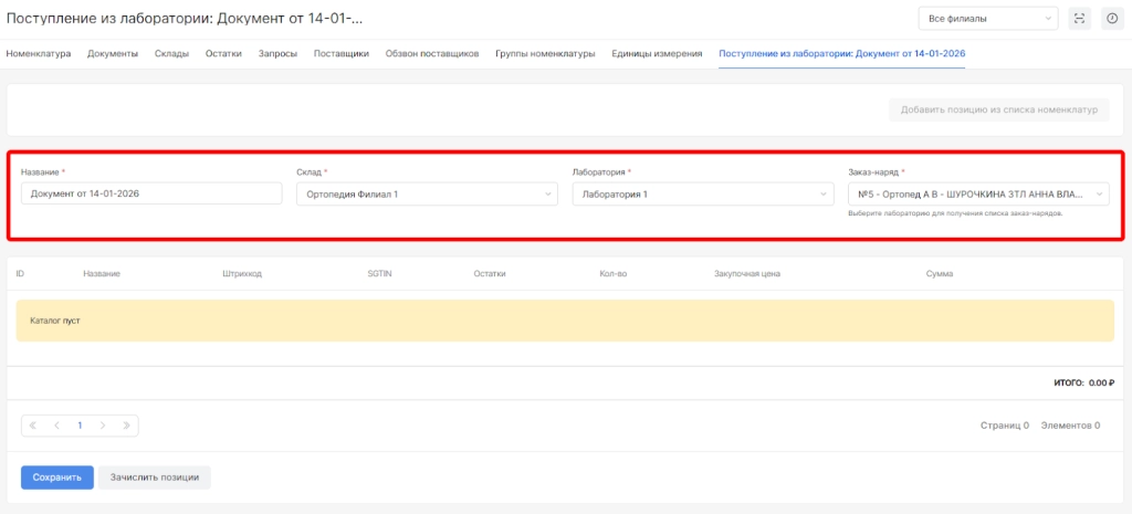 Поступление из лаборатории - это документ, который может создаваться автоматически или вручную, с целью фиксации прихода изготовленного материала из зуботехнической лаборатории.