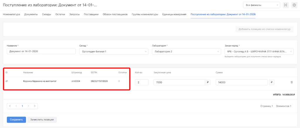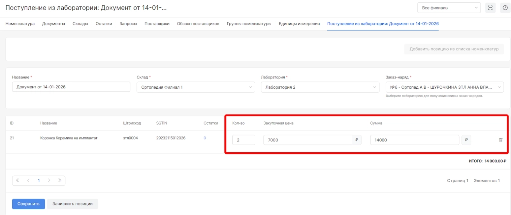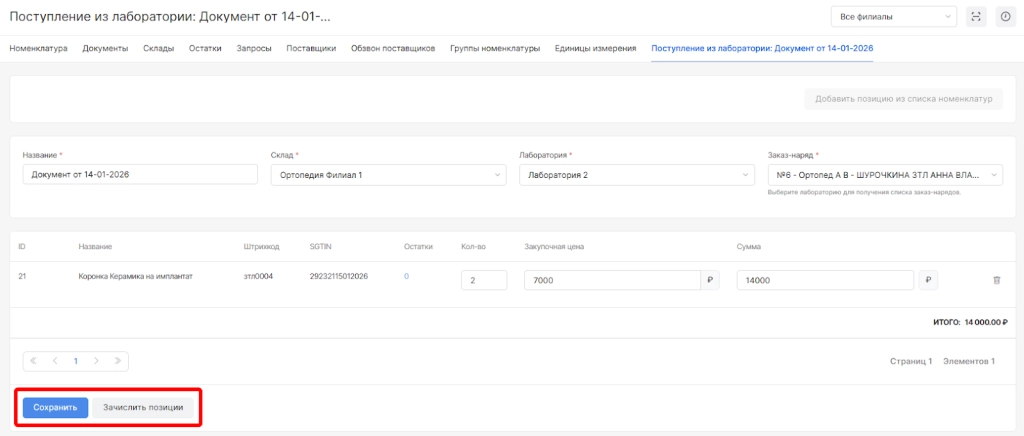 сохранить с проведением, нажав на опцию “Зачислить позиции”