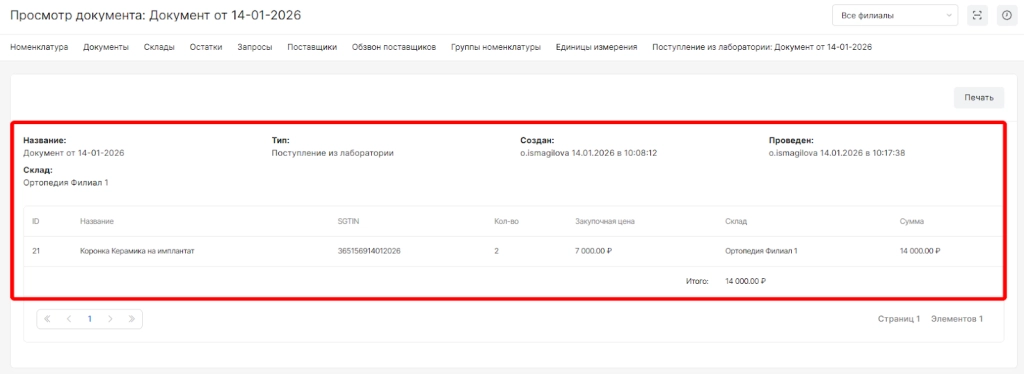 После завершения настроек данный тип документа будет доступен для создания при наличии сформированного заказ-наряда в лабораторию.