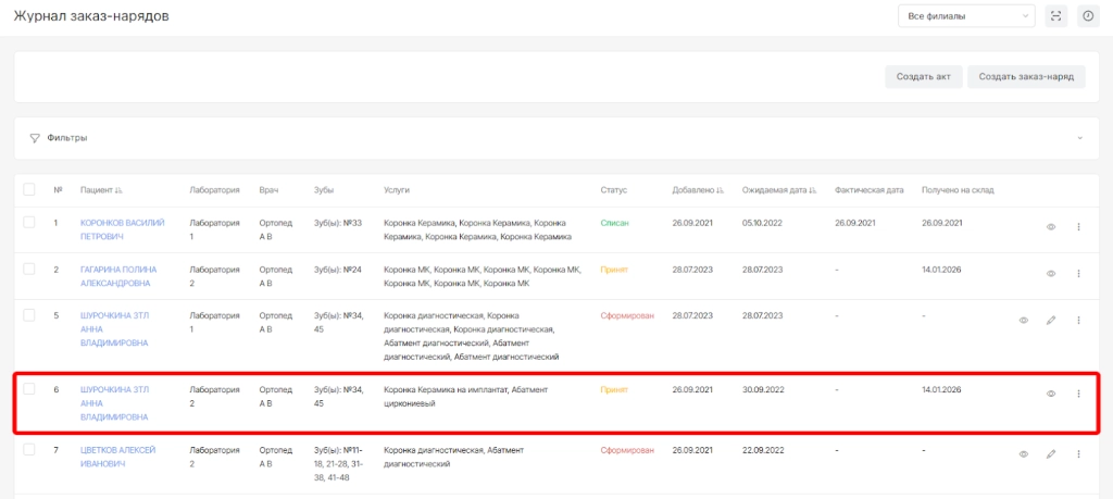 Также в модуле “ЗТЛ”, в разделе “Журнал заказ-нарядов” по принятому заказ-наряду пациента отобразится статус “Принят” и дата получения на склад