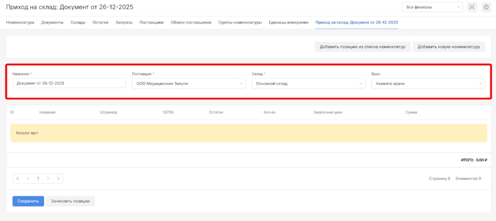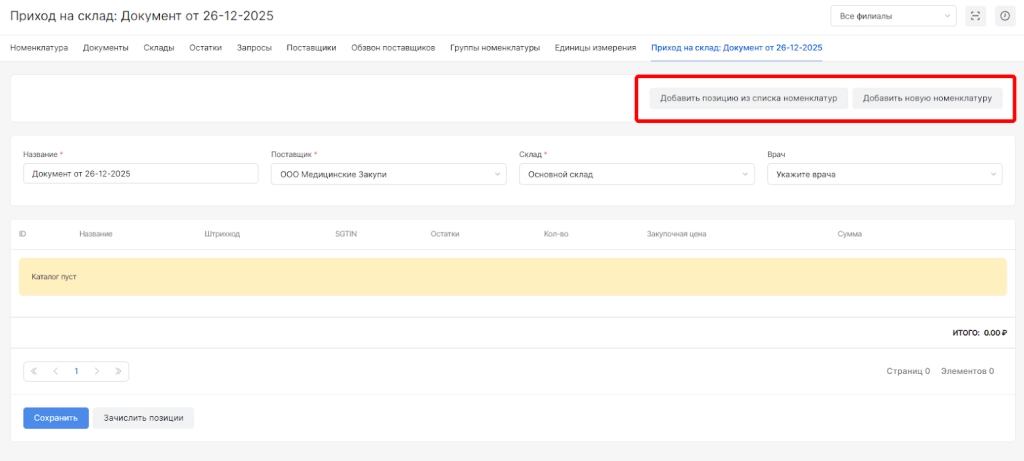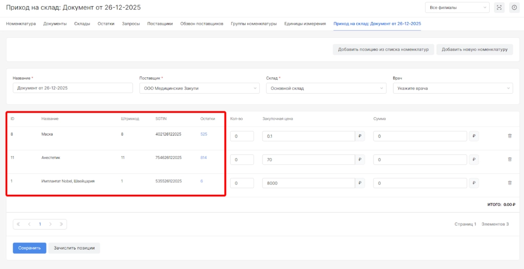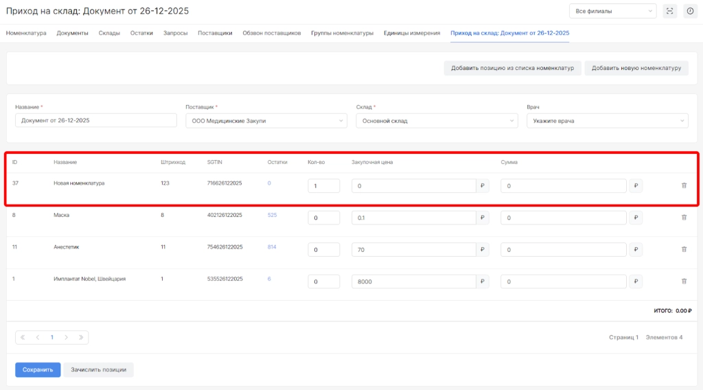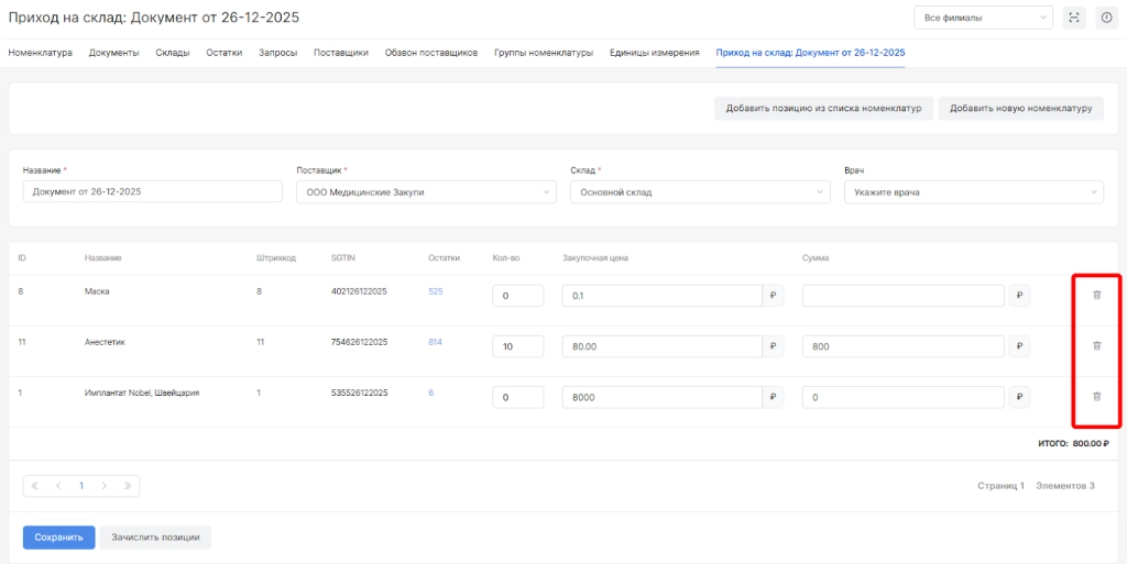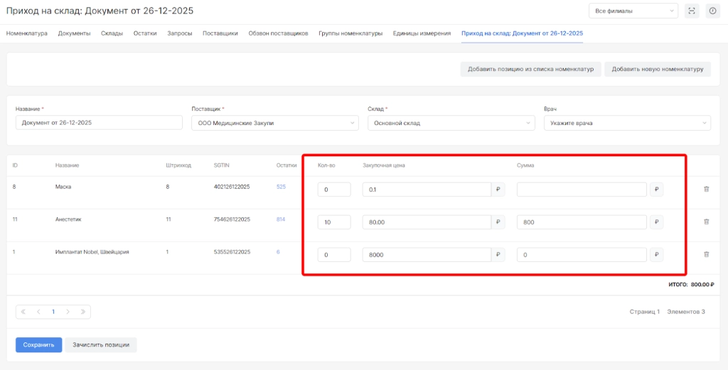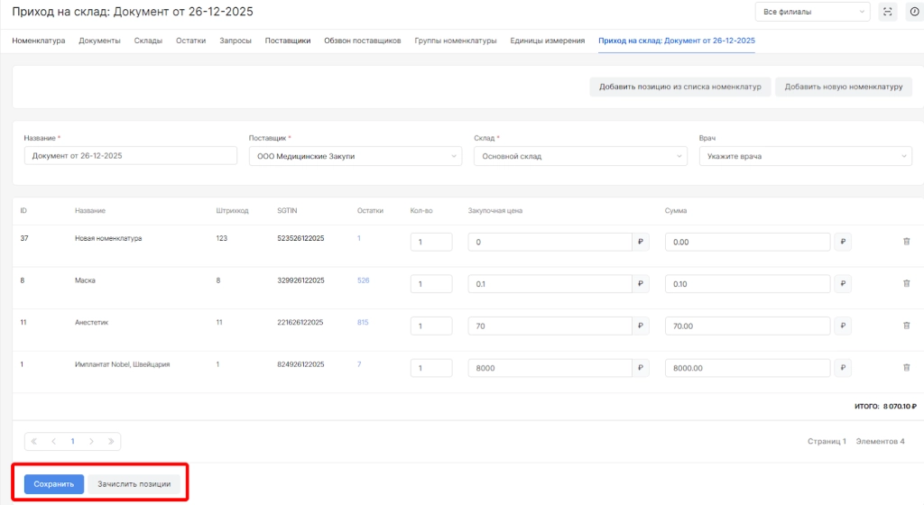 сохранить с проведением, нажав на опцию “Зачислить позиции”