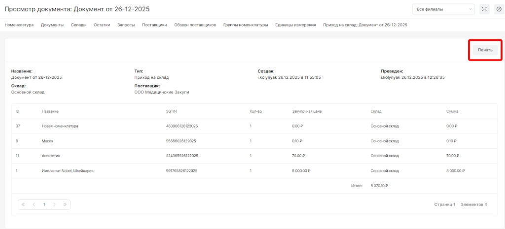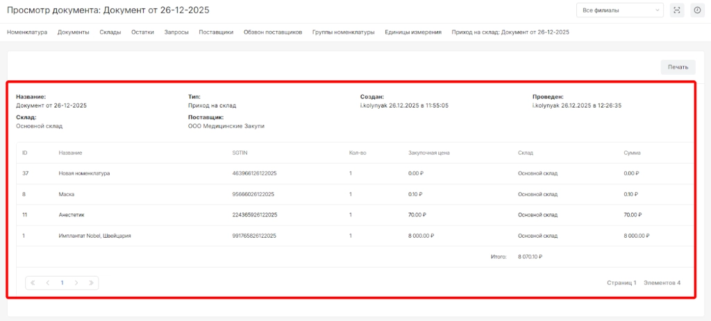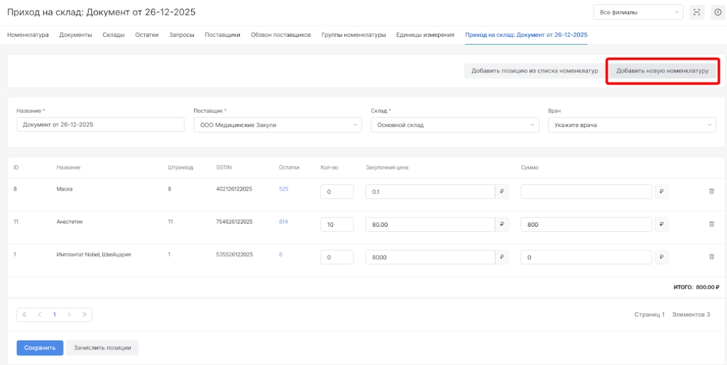 После сохранения новой номенклатуры она будет добавлена в список документа прихода и по ней также необходимо будет указать: