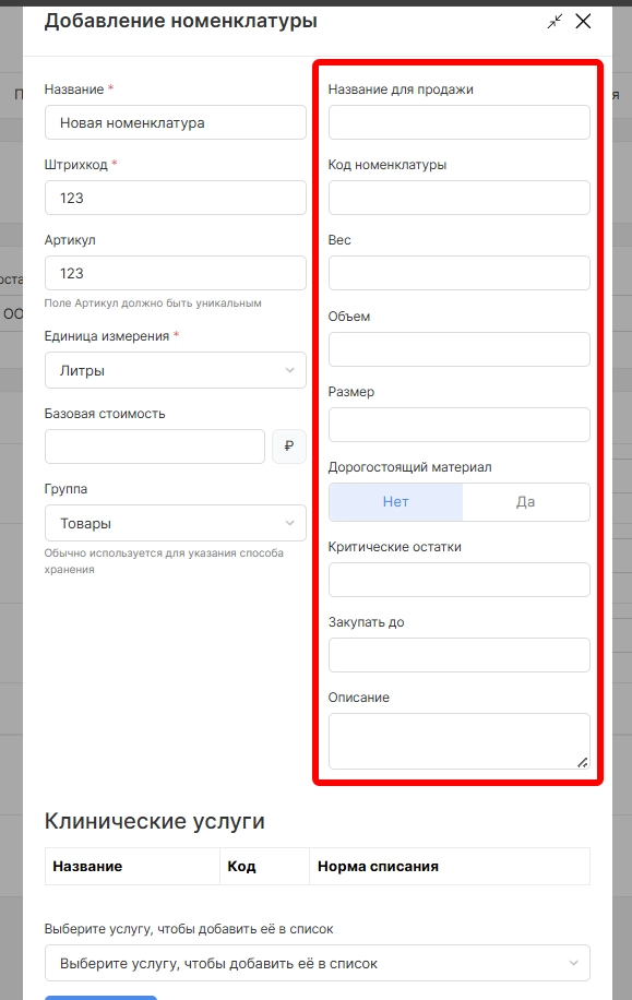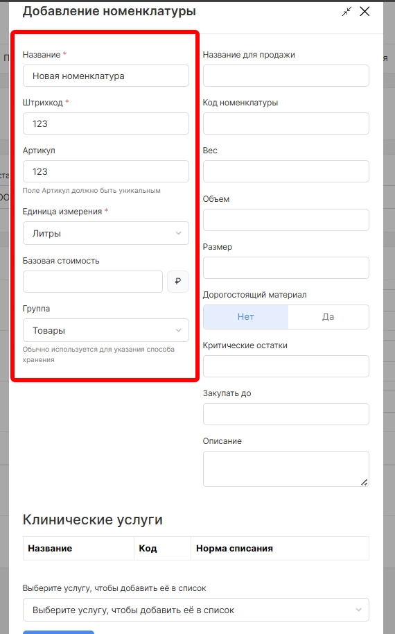 ВНИМАНИЕ! Заполнение необязательных полей по новой номенклатуре можно будет произвести позже, после проведения документа прихода в разделе “Номенклатура” модуля “Склад”. Подробная информация об этом указана в статье Номенклатура и ручная настройка
