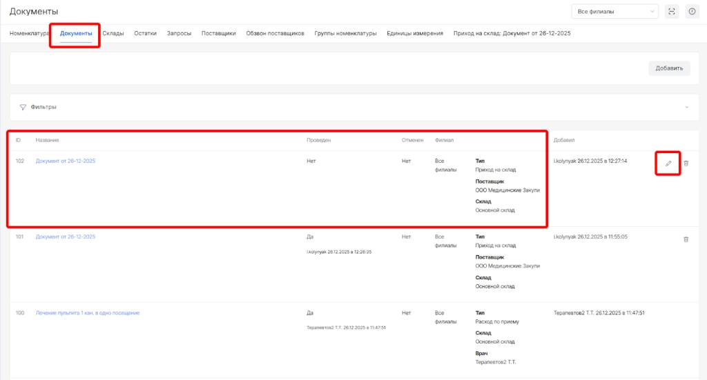 После сохранения без проведения, количество по документу НЕ будет зачислено на склад и для завершения проведения можно будет вернуться позже, найдя документ в списке документов склада и нажав опцию “Редактировать”