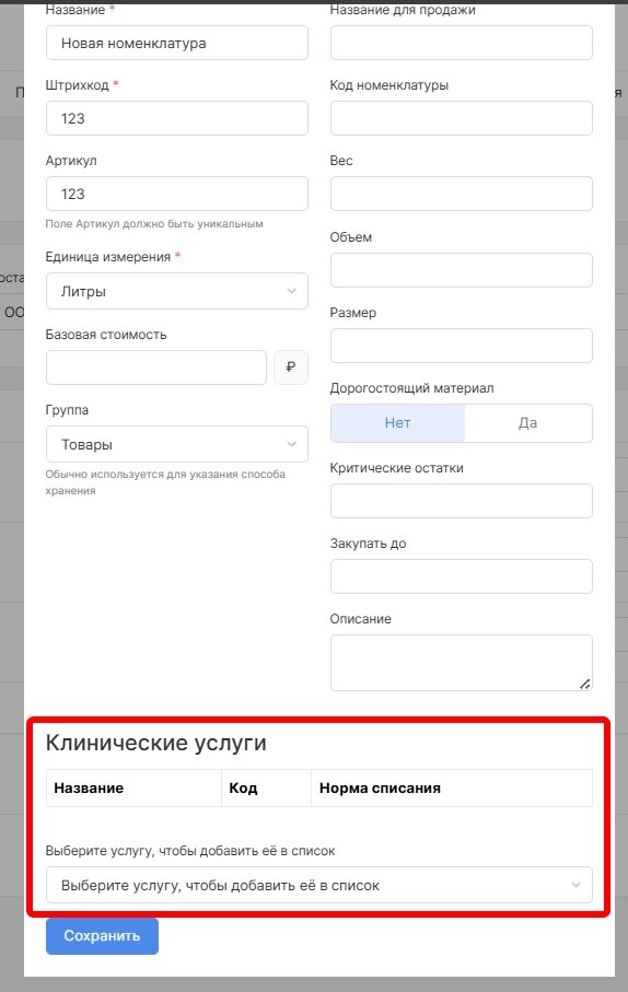 настроить клинические услуги для авто расхода по услугам врачей (НЕ обязательно)