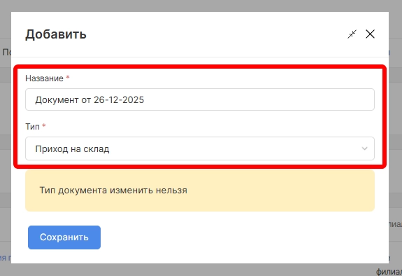 Для создания документа необходимо в модуле “Склад” открыть раздел “Документы” и выбрать опцию “Добавить”