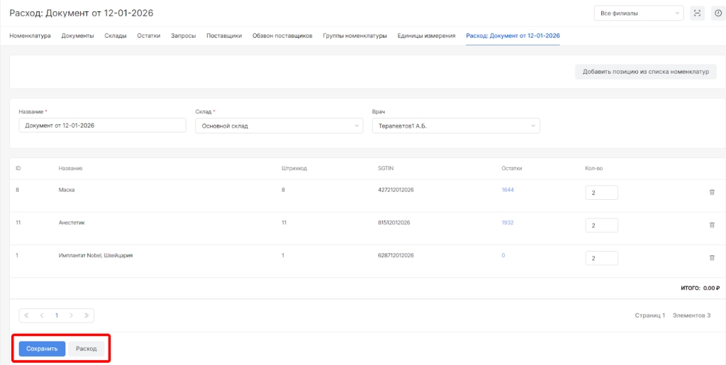 сохранить с проведением, нажав на опцию “Расход”