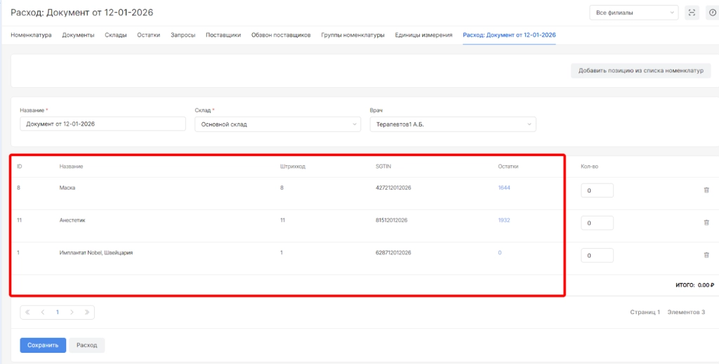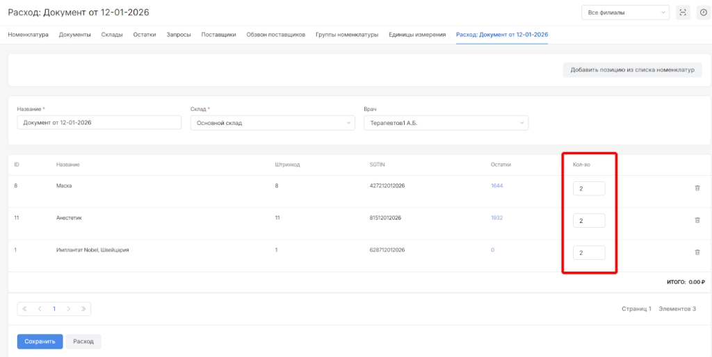 Далее необходимо указать реальные значения номенклатур для проведения документа по колонке “количество” для проведения в документе