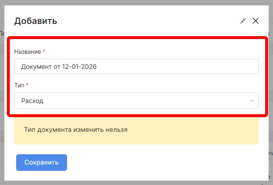 Для создания документа необходимо в модуле “Склад” открыть раздел “Документы” и выбрать опцию “Добавить”