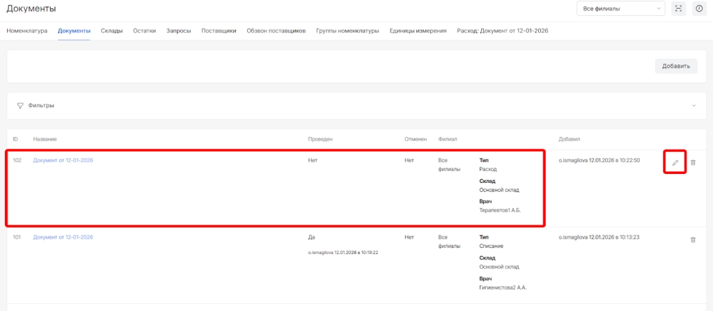 После сохранения без проведения, количество по документу НЕ будет списано со склада и для завершения проведения можно будет вернуться позже, найдя документ в списке документов склада и нажав опцию “Редактировать”