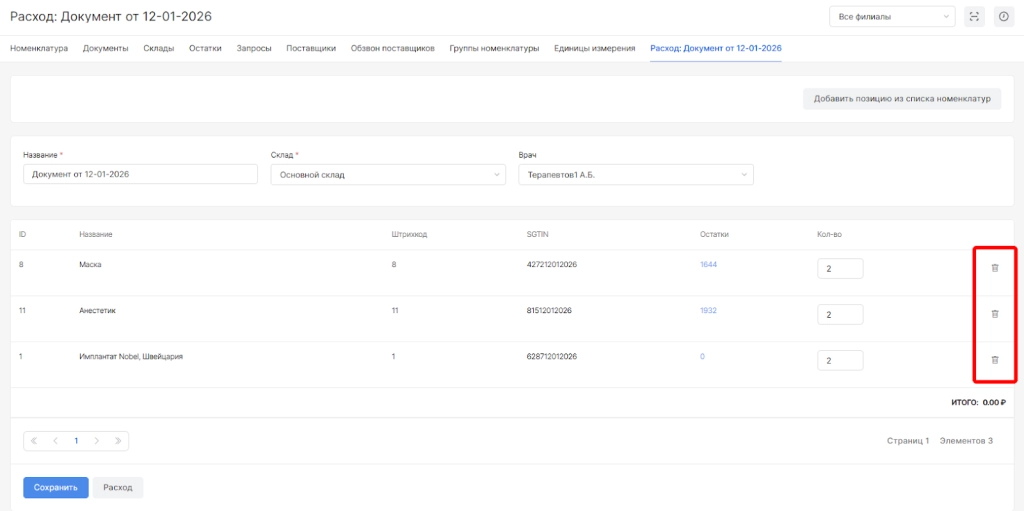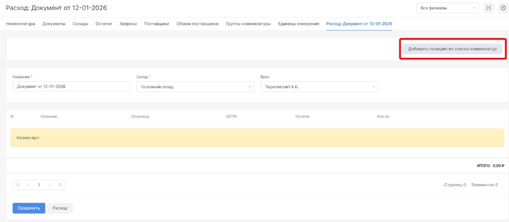 Для наполнения документа номенклатурами необходимо вверху страницы выбрать опцию “Добавить позицию из списка номенклатур”