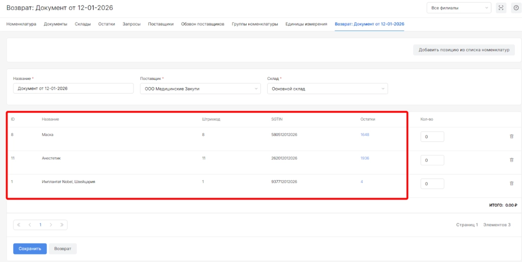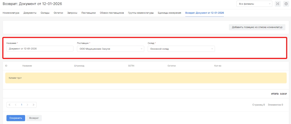 выбрать поставщика для возврата номенклатур