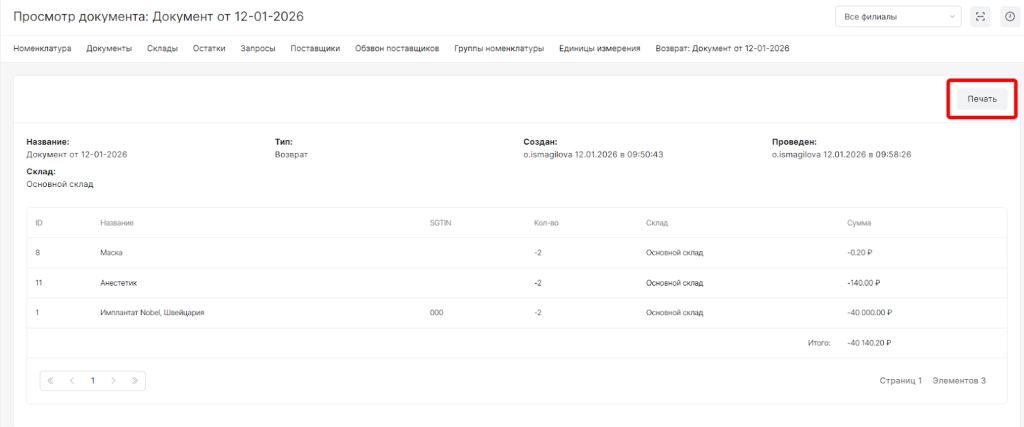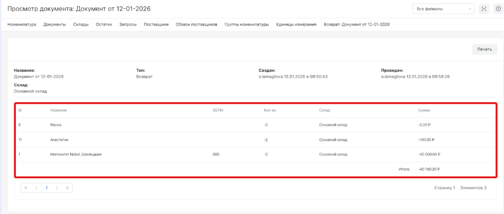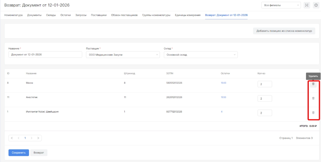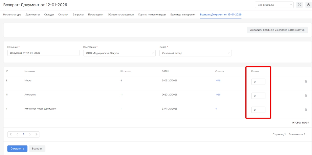 Возврат - это тип документа, позволяющий зафиксировать убытие со склада по причине возврата номенклатур поставщику.